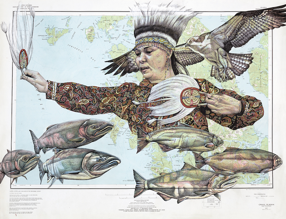 Ink and Colored Pencil on Vintage 1951 Alaska Topographic Map 23 x 30in